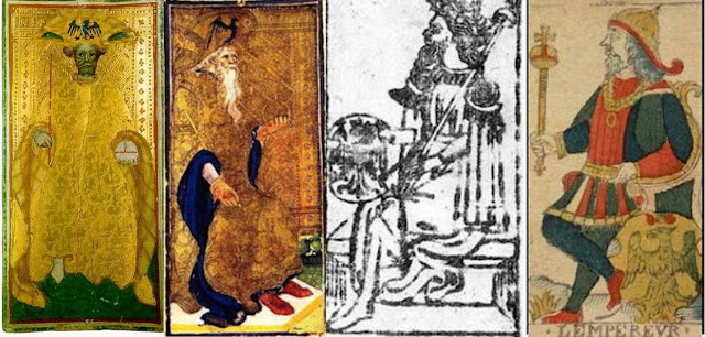 The next surviving card with the eagle, of the 1450s (2nd from left above), is from the following ruler of Milan, Francesco Sforza, whose wife was the daughter of the previous Visconti duke. Called the Visconti-Sforza, it is similar to the preceding except for having an older-looking man with a white beard.