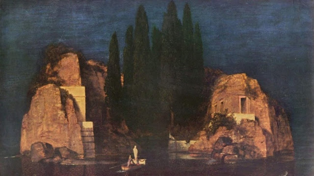 it is the utter stillness and solitude of the grave. A man is completely cut off on such an island. For who goes there? Only the dead that never return. So it is also an eternal prison, and he himself is a sort of ghost landing there. (p. 1183)Nichols even gives us a painting of such a place, done in Basel, Switzerland, in 1880. Nietzsche, based in Basel at the time (a professor there until 1879), would probably have known it when he was writing Zarathustra (published in 1883). Jung refers to the painting: